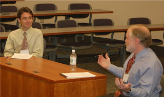 Vaidhyanathan's program was followed by Reference 2010: The Sky is Falling and a New Day Dawns. Ben Doherty and Kent Olson from UVA's Law Library played the characters of Gloom and Doom, and took us through various adverse reference scenarios (the Sky is Falling) and offered a different view of the situation (a New Day Dawns).