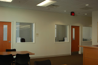 The new library has more shelving -- this is a good thing in times when libraries are contracting rather than expanding; study carrels; a computer lab that is enclosed; a group study room; an expanded reference/circulation desk where two people can work in comfort; and a new office for the library director.